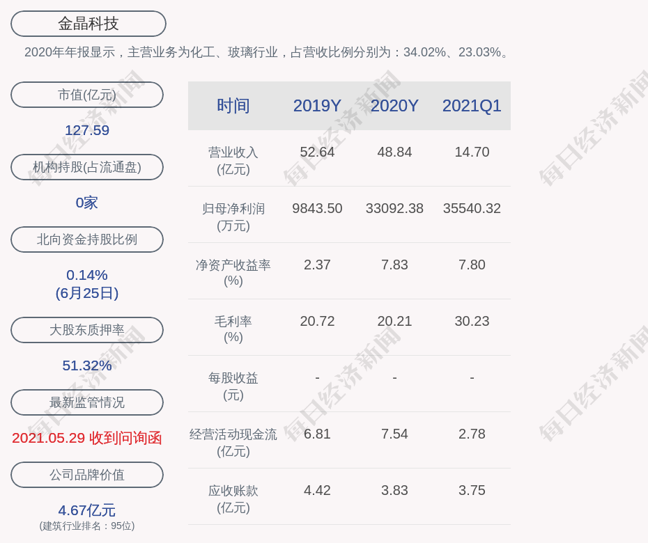 2020年年報顯示,金晶科技的主營業務為化工、玻璃行業,占營收比例分別為:34.02%、23.03%。