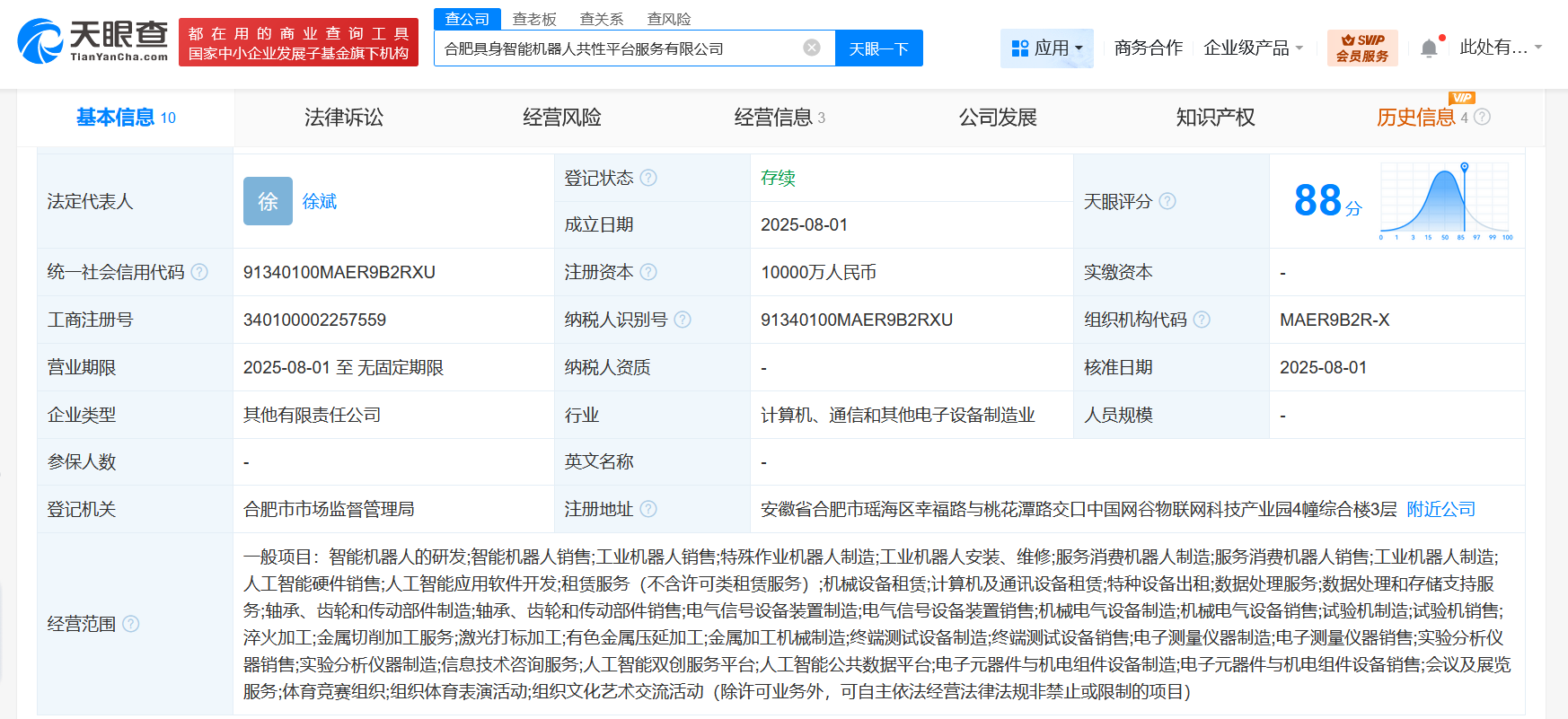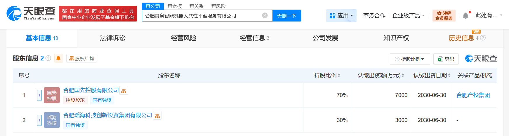 每經(jīng)AI快訊,天眼查App顯示,近日,合肥具身智能機器人共性平臺服務有限公司成立,法定代表人為徐斌,注冊資本1億元人民幣,經(jīng)營范圍含智能機器人的研發(fā)、智能機器人銷售、工業(yè)機器人銷售、特殊作業(yè)機器人制造、服務消費機器人銷售、計算機及通訊設備租賃、數(shù)據(jù)處理服務、數(shù)據(jù)處理和存儲支持服務等。股東信息顯示,該公司由合肥國先控股有限公司、合肥瑤海科技創(chuàng)新投資集團有限公司共同持股。