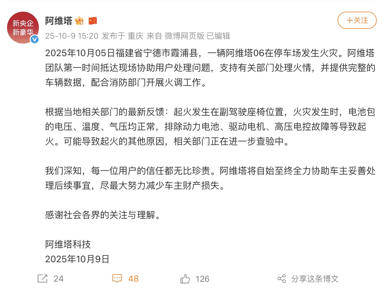 10月9日,@阿維塔發(fā)布情況說(shuō)明:2025年10月05日福建省寧德市霞浦縣,一輛阿維塔06在停車(chē)場(chǎng)發(fā)生火災(zāi)。阿維塔團(tuán)隊(duì)第一時(shí)間抵達(dá)現(xiàn)場(chǎng)協(xié)助用戶(hù)處理問(wèn)題,支持有關(guān)部門(mén)處理火情,并提供完整的車(chē)輛數(shù)據(jù),配合消防部門(mén)開(kāi)展火調(diào)工作。根據(jù)當(dāng)?shù)叵嚓P(guān)部門(mén)的最新反饋:起火發(fā)生在副駕駛座椅位置,火災(zāi)發(fā)生時(shí),電池包的電壓、溫度、氣壓均正常,排除動(dòng)力電池、驅(qū)動(dòng)電機(jī)、高壓電控故障等導(dǎo)致起火。可能導(dǎo)致起火的其他原因,相關(guān)部門(mén)正在進(jìn)一步查驗(yàn)中。