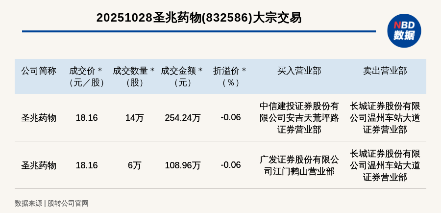 每經(jīng)訊,2025年10月28日,新三板創(chuàng)新層公司圣兆藥物(832586,收盤價:18.17元)發(fā)生2筆大宗交易,總成交金額為363.2萬元,成交金額最高的一筆成交價18.16元/股,成交數(shù)量14萬股,成交金額254.24萬元,折價0.06%。買入營業(yè)部是中信建投證券股份有限公司安吉天荒坪路證券營業(yè)部,賣出營業(yè)部是長城證券股份有限公司溫州車站大道證券營業(yè)部。