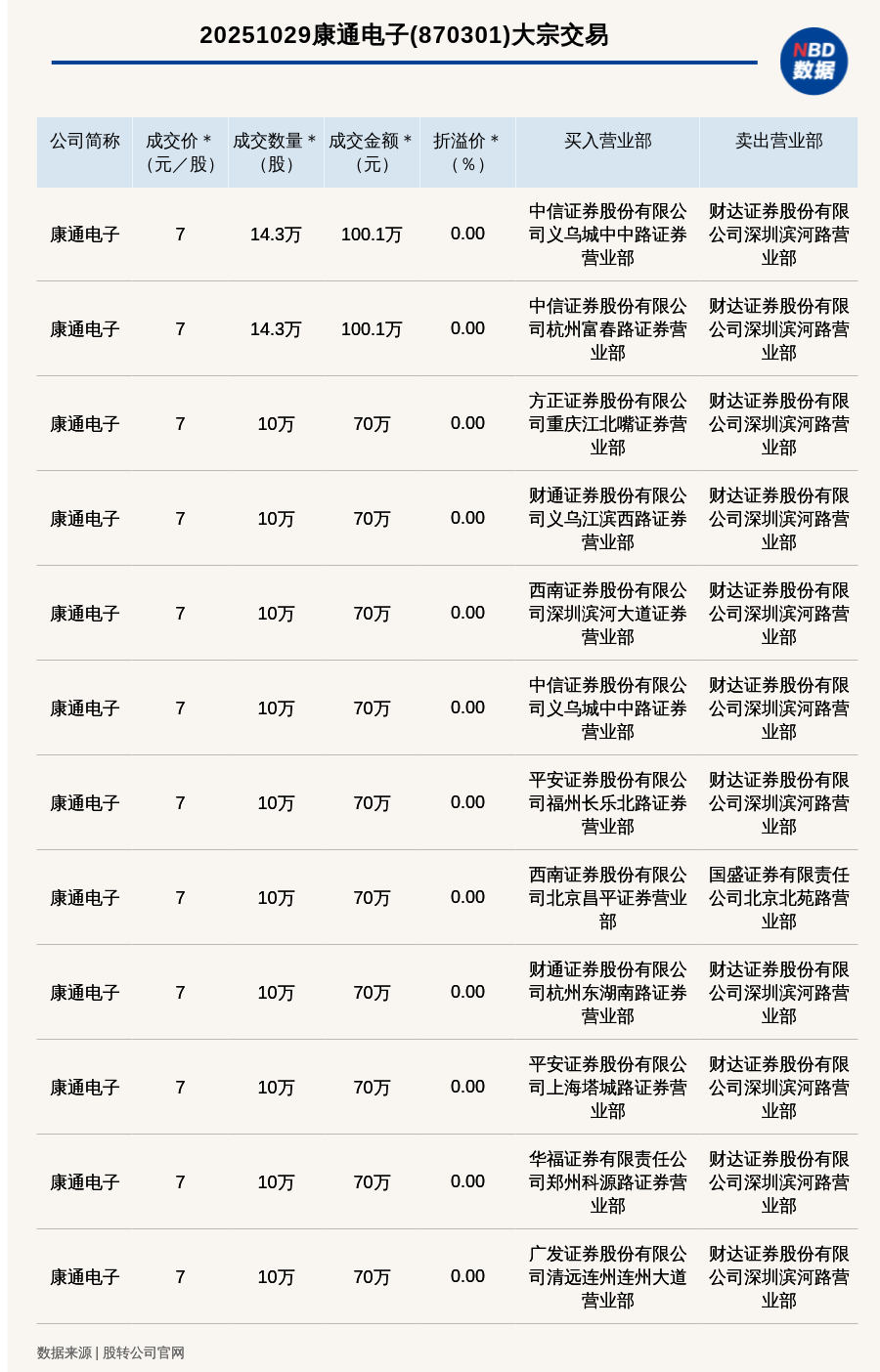 每經訊,2025年10月29日,新三板創新層公司康通電子(870301,收盤價:7元)發生12筆大宗交易,總成交金額為900.2萬元,成交金額最高的一筆成交價7元/股,成交數量14.3萬股,成交金額100.1萬元,為平價交易。買入營業部是中信證券股份有限公司義烏城中中路證券營業部,賣出營業部是財達證券股份有限公司深圳濱河路營業部。
