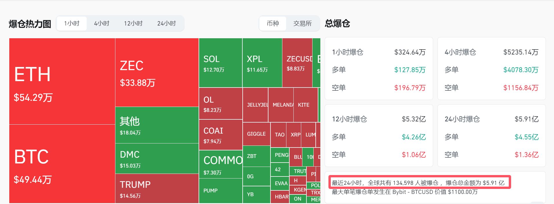 coinglass數據顯示,24小時內,加密貨幣全網合約爆倉5.91億美元,爆倉人數達到13.45萬人。