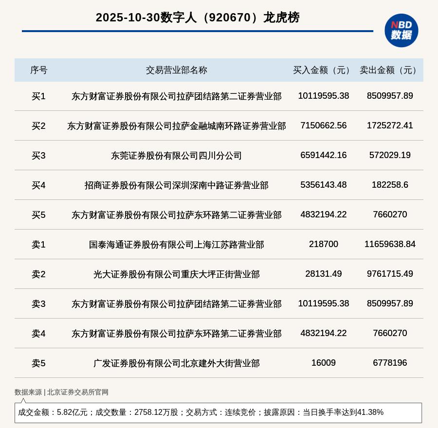 每經訊,2025年10月30日,北交所上市公司數字人(920670,收盤價:18.48元)登上龍虎榜,交易方式是連續競價,披露原因是當日換手率達到41.38%,成交數量2758.12萬股,成交金額5.82億元。買一席位為東方財富證券股份有限公司拉薩團結路第二證券營業部,買入1011.96萬元;賣一席位為國泰海通證券股份有限公司上海江蘇路營業部,賣出1165.96萬元。
