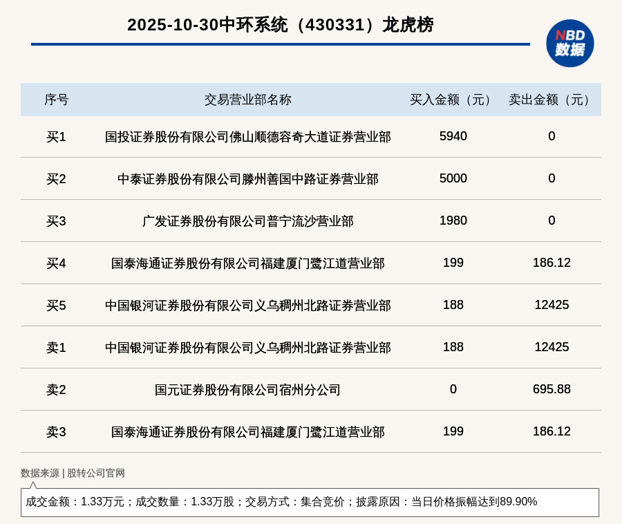 每經訊,2025年10月30日,新三板基礎層公司中環系統(430331,收盤價:0.99元)登上龍虎榜,交易方式是集合競價,披露原因是當日價格振幅達到89.90%,成交數量1.33萬股,成交金額1.33萬元。買一席位為國投證券股份有限公司佛山順德容奇大道證券營業部,買入5940元;賣一席位為中國銀河證券股份有限公司義烏稠州北路證券營業部,賣出1.24萬元。