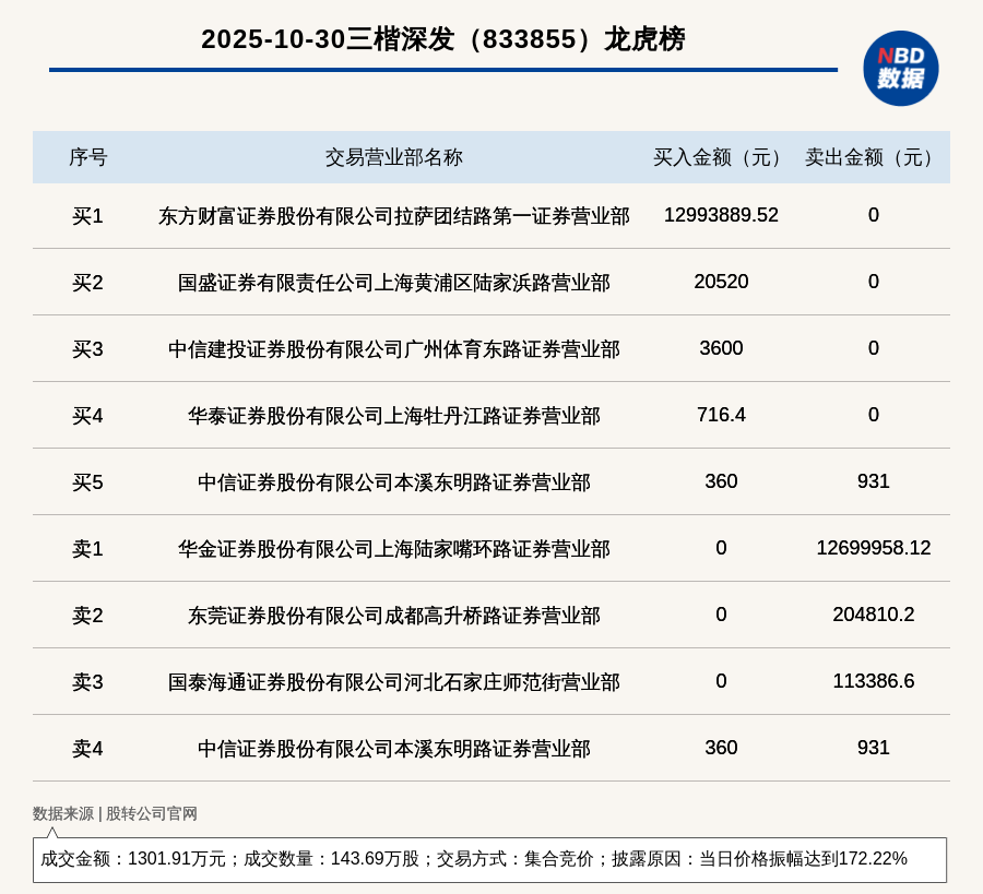 每經訊,2025年10月30日,新三板創新層公司三楷深發(833855,收盤價:3.6元)登上龍虎榜,交易方式是集合競價,披露原因是當日價格振幅達到172.22%,成交數量143.69萬股,成交金額1301.91萬元。買一席位為東方財富證券股份有限公司拉薩團結路第一證券營業部,買入1299.39萬元;賣一席位為華金證券股份有限公司上海陸家嘴環路證券營業部,賣出1270萬元。