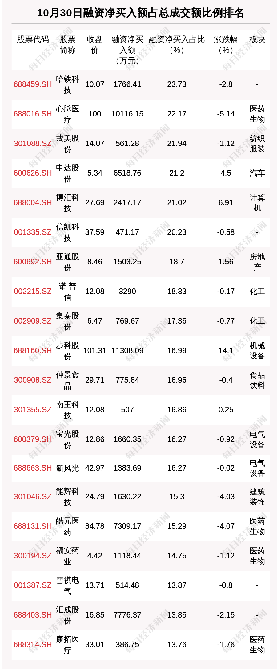10月30日兩市共有1588只個股有融資資金凈買入。共有53只股票融資凈買入額占總成交金額比例超10%,其中哈鐵科技、心脈醫療、戎美股份排名前三,占比分別為23.73%、22.17%、21.94%。