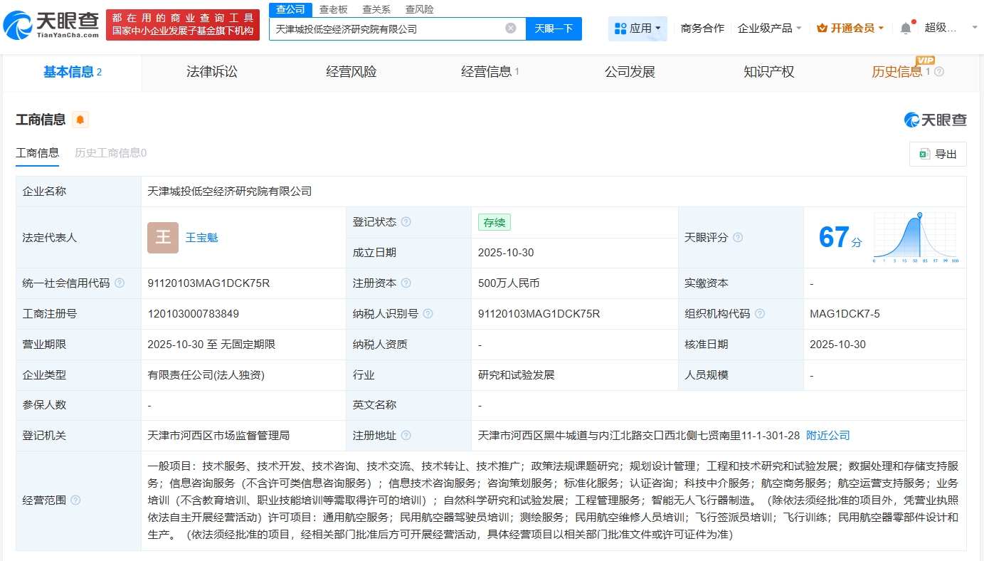 每經(jīng)AI快訊,天眼查App顯示,近日,天津城投低空經(jīng)濟(jì)研究院有限公司成立,法定代表人為王寶魁,注冊(cè)資本500萬元人民幣,經(jīng)營范圍包括工程和技術(shù)研究和試驗(yàn)發(fā)展、自然科學(xué)研究和試驗(yàn)發(fā)展、智能無人飛行器制造等。股權(quán)全景穿透圖顯示,該公司由天津低空經(jīng)濟(jì)投資發(fā)展有限公司全資持股,后者為天津城市基礎(chǔ)設(shè)施建設(shè)投資集團(tuán)有限公司全資子公司。