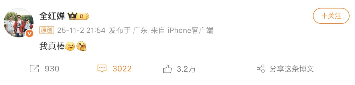 11月2日晚,全紅嬋在社交媒體上發文:“我真棒”。