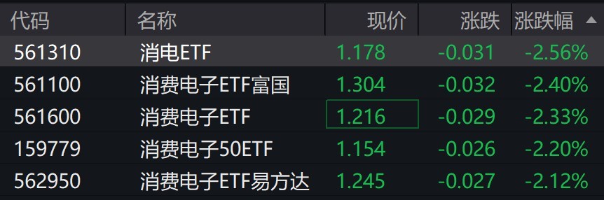 受盤面影響,跟蹤中證消費電子主題指數(shù)的ETF跌超2%。