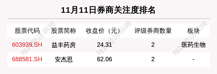 從券商對個股的關注程度來看,有2只個股獲得多家券商關注,券商關注數量排名居前的個股是益豐藥房(603939.SH)、安杰思(688581.SH)。