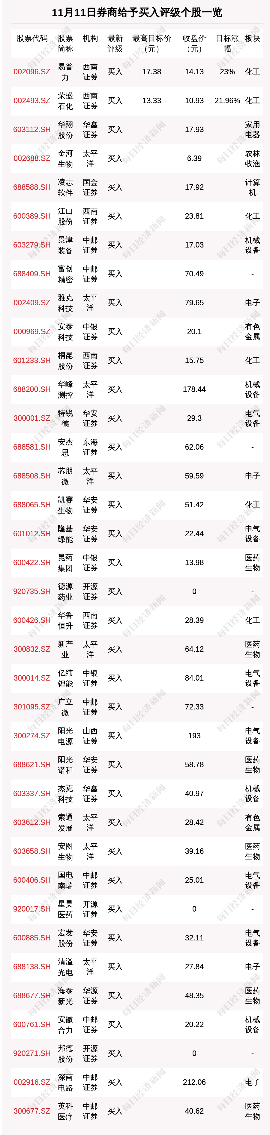 11月11日71只個股獲券商關注,易普力目標漲幅達23%