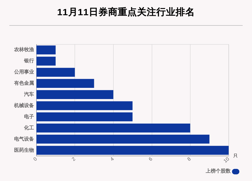 從券商對行業的關注度來看,券商關注個股數居前的行業分別是醫藥生物、電氣設備、化工。