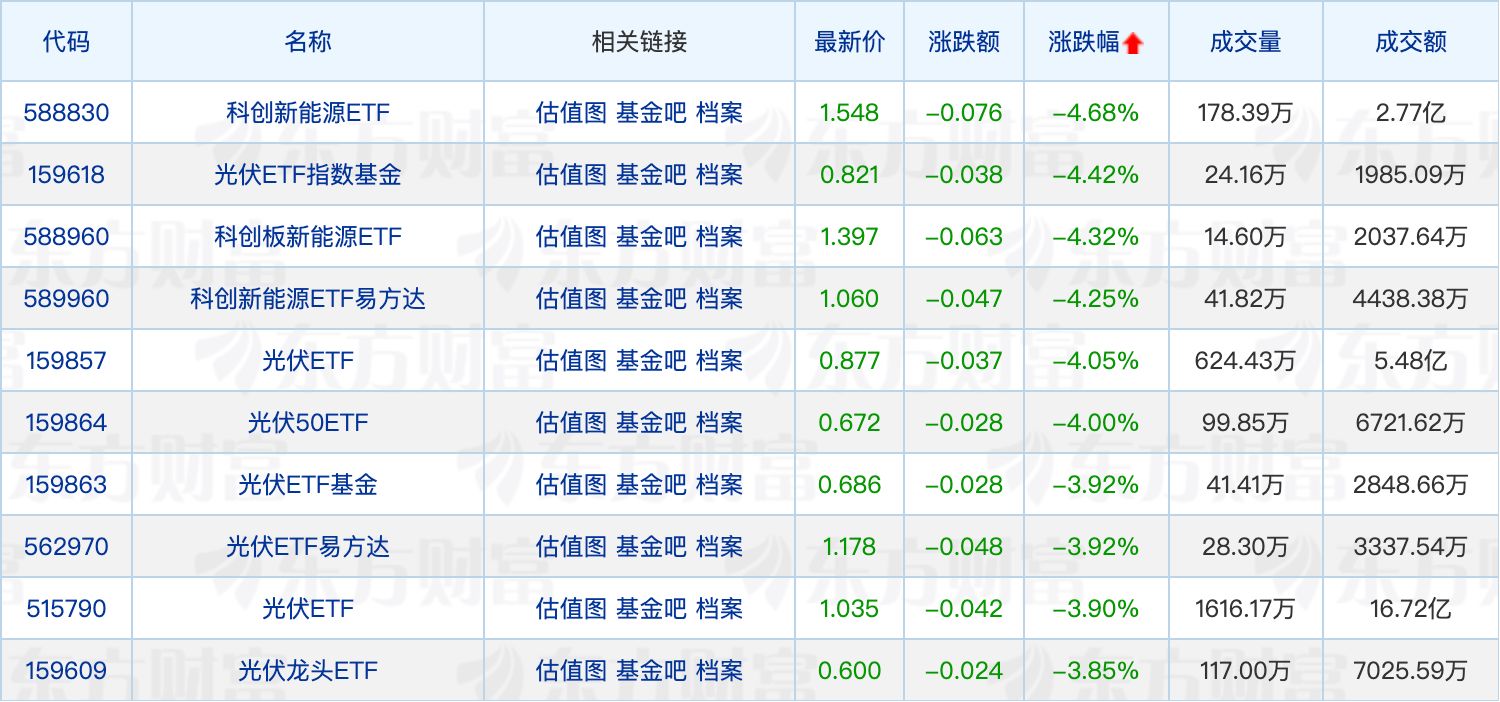 下跌方面,科創新能源ETF領跌4.68%,光伏相關ETF悉數回調。