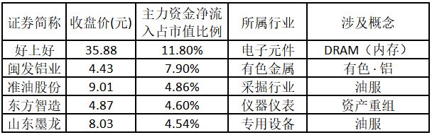 主力資金凈流入金額占市值比例排名前5的個股分別為好上好、閩發鋁業、準油股份、東方智造、山東墨龍。