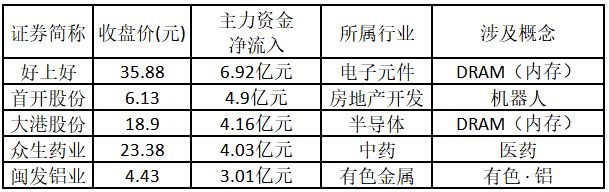 從主力資金來看,今日漲停板個股中,主力資金凈流入金額排名前5的個股分別為好上好、首開股份、大港股份、眾生藥業、閩發鋁業。