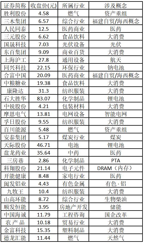漲停板個股中,股價創出近一年新高的個股有30只(不包括創出歷史新高的個股),包括勝利股份、三木集團、人民同泰、三元股份、國晟科技、東百集團、上海滬工、同興科技、合富中國、中糧糖業、康隆達、石大勝華、中銳股份、摩恩電氣、孚日股份、百川能源、安泰集團、天際股份、盤龍藥業、三房巷、科翔股份、開能健康、閩發鋁業、九牧王、山高環能、順發恒能、中國海誠、農產品、金富科技、德龍匯能,具體如下表所示。