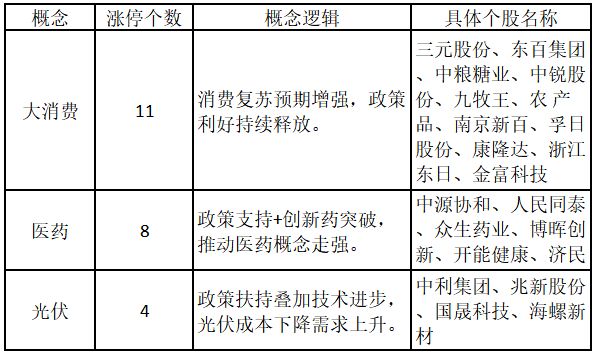 從概念特征來看,今日漲停板個股中,大消費、醫藥、光伏概念的個股最多。