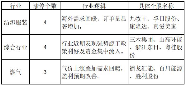 從行業特征來看,今日漲停板個股中,紡織服裝、綜合行業、燃氣行業的個股最多。