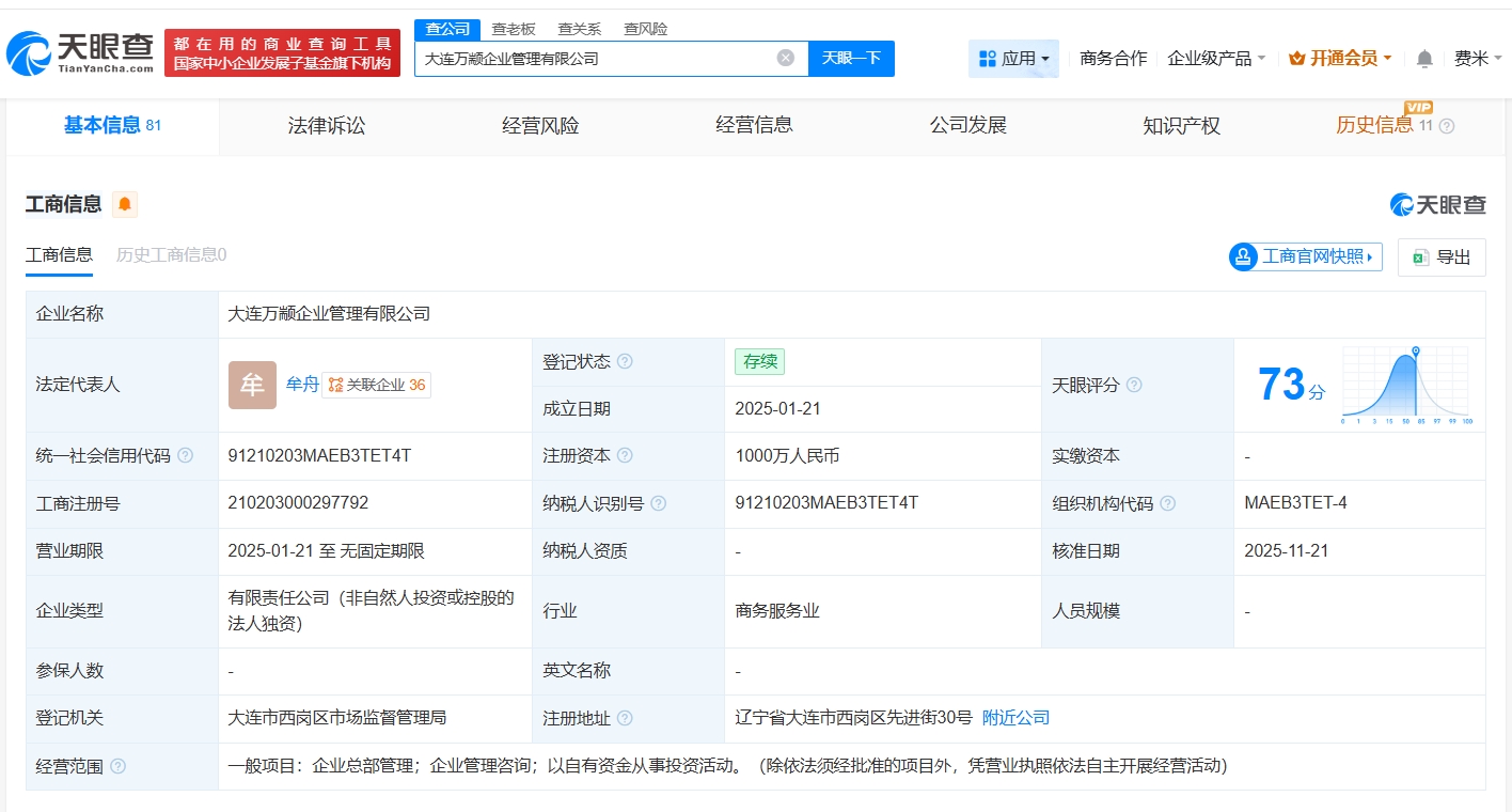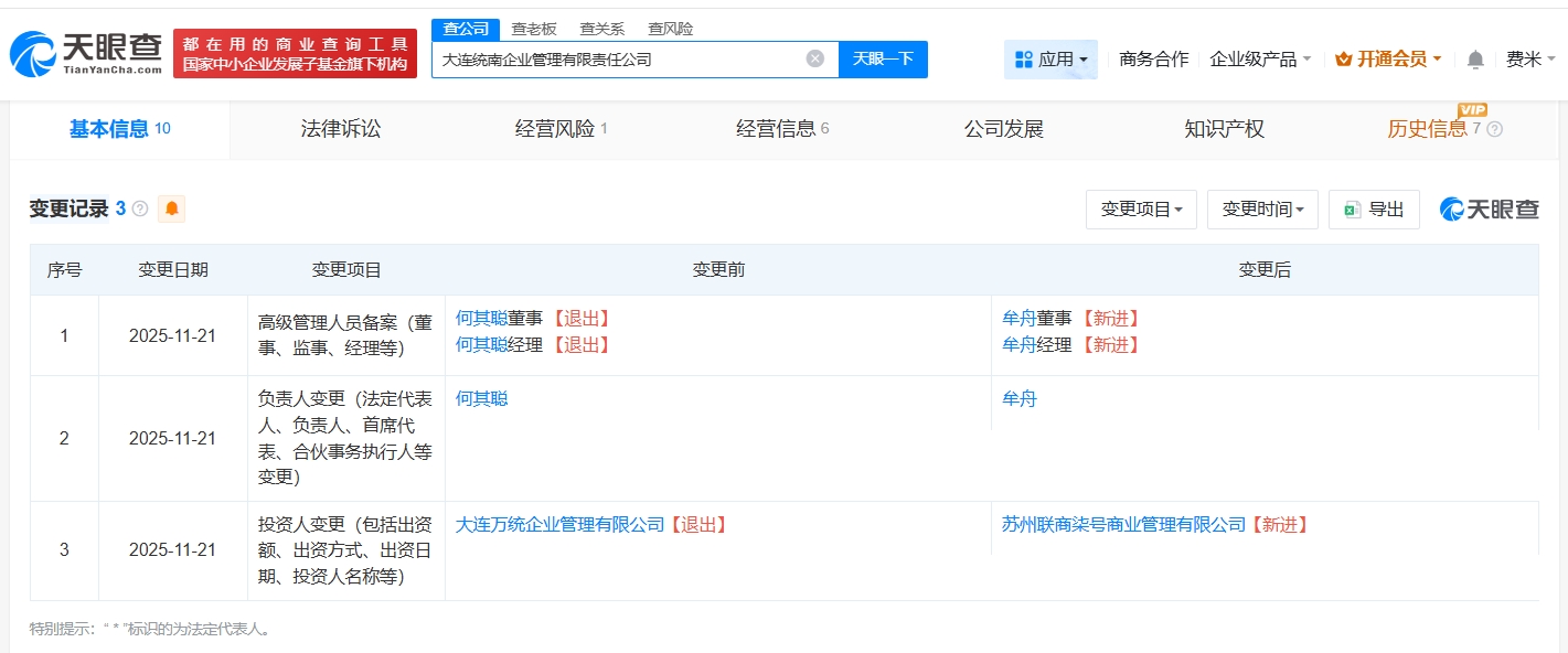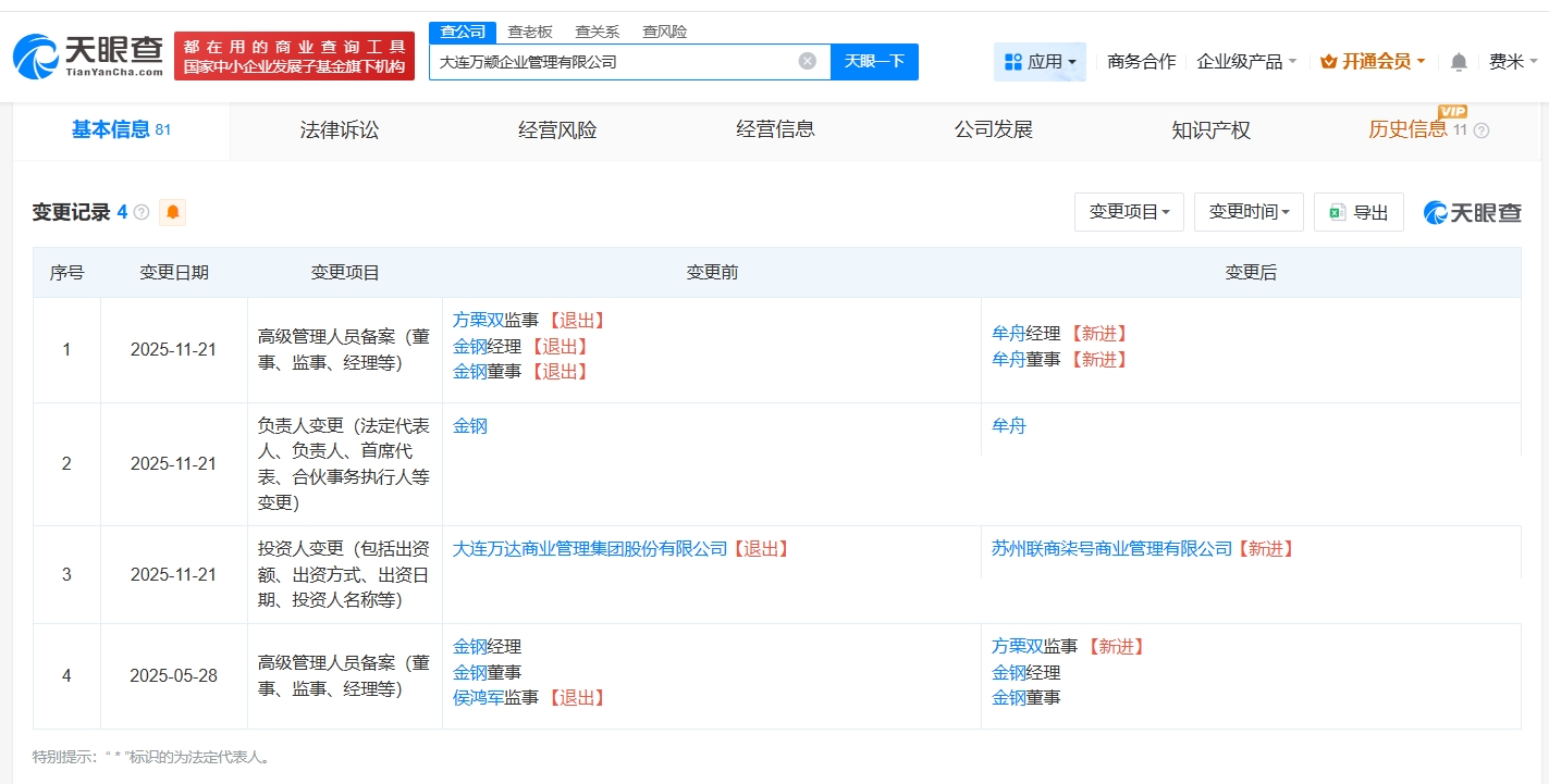 每經AI快訊,天眼查工商信息顯示,近日,大連萬顓企業管理有限公司發生工商變更,原股東大連萬達商業管理集團股份有限公司退出,新增浙金信托旗下蘇州聯商柒號商業管理有限公司為全資股東,同時發生法定代表人、主要人員變更。此外,蘇州聯商柒號商業管理有限公司還接手了大連萬達商業管理集團股份有限公司旗下的大連統南企業管理有限責任公司。大連萬顓企業管理有限公司、大連統南企業管理有限責任公司分別成立于今年1月、今年3月,法定代表人均為牟舟,注冊資本均為1000萬元人民幣,經營范圍為企業總部管理、企業管理咨詢、以自有資金從事投資活動。