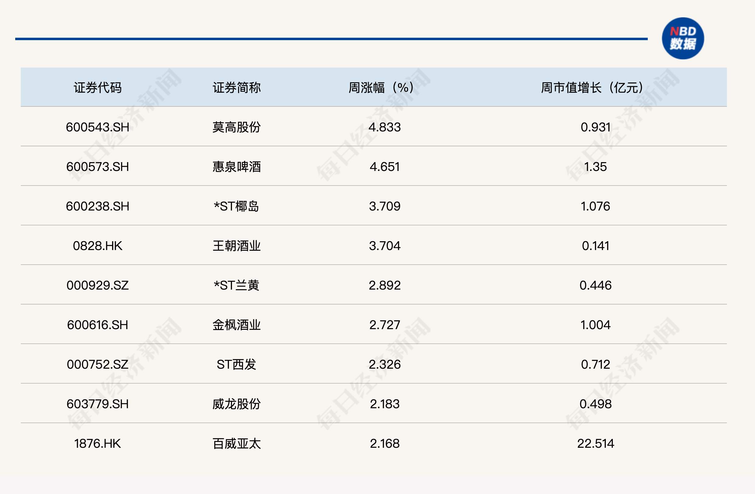 非白酒板塊方面,莫高股份和惠泉啤酒的周漲幅均達到4%;*ST椰島和王朝酒業的周漲幅也超過3%,漲幅領先。