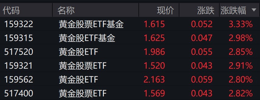 受盤面影響,黃金股相關(guān)ETF漲約3%。