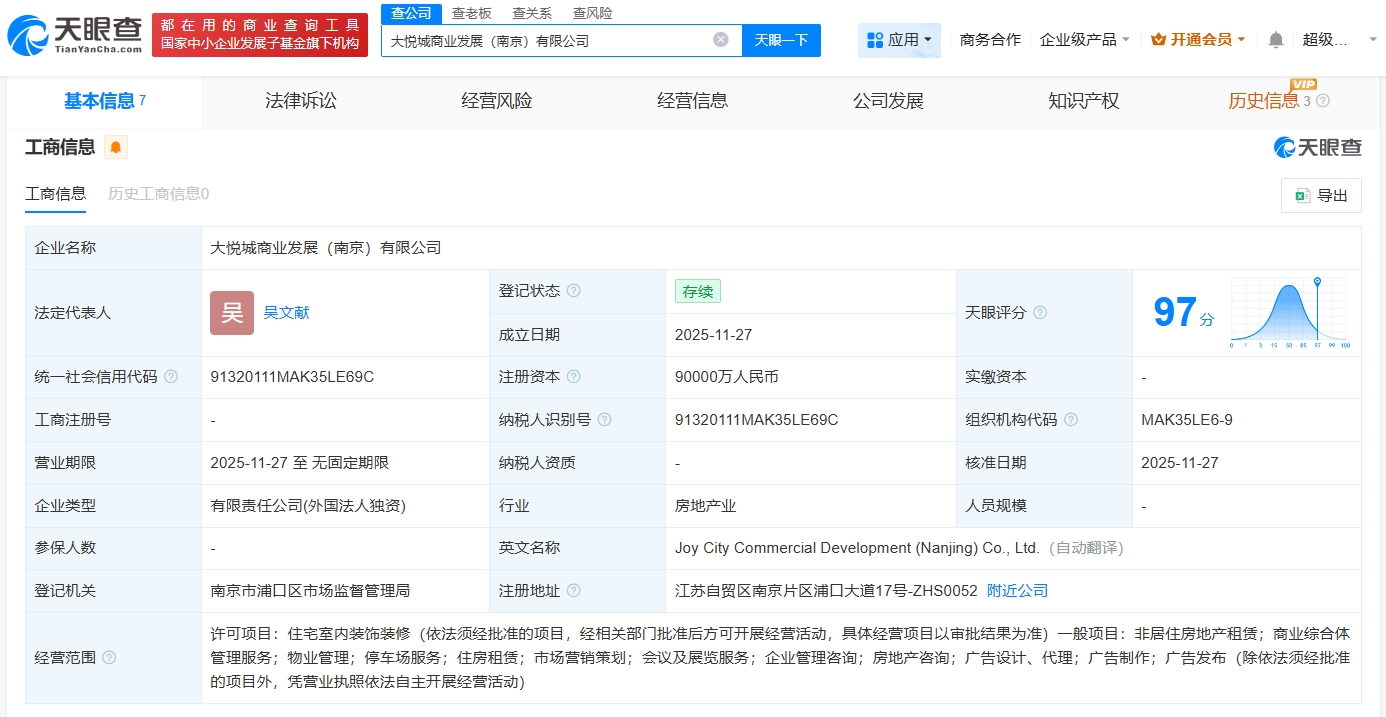 每經(jīng)AI快訊,天眼查App顯示,近日,大悅城商業(yè)發(fā)展(南京)有限公司成立,法定代表人為吳文獻,注冊資本9億元人民幣,經(jīng)營范圍包括非居住房地產(chǎn)租賃、商業(yè)綜合體管理服務(wù)、物業(yè)管理、市場營銷策劃等。股東信息顯示,該公司由JOYCITYPROPERTYLIMITED全資持股。