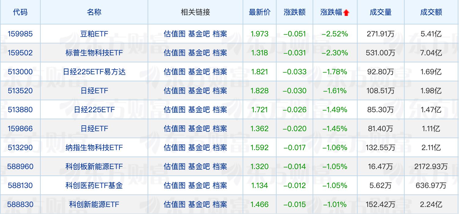 下跌方面,豆粕ETF領(lǐng)跌2.52%,日經(jīng)225相關(guān)ETF悉數(shù)回調(diào)。