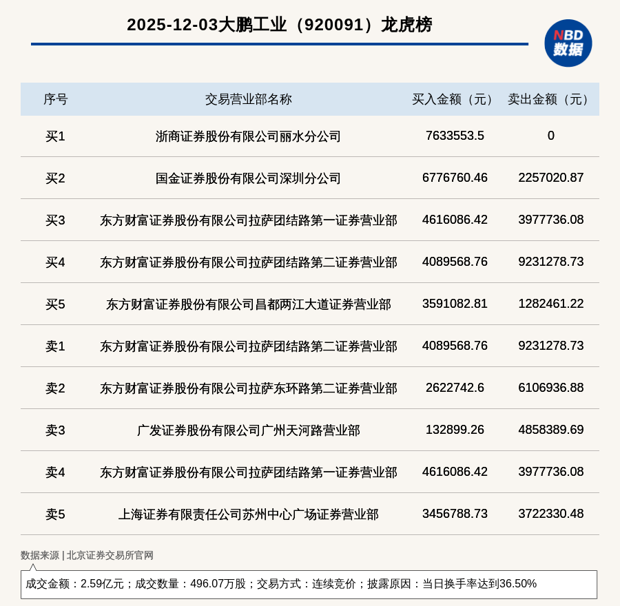 每經訊,2025年12月3日,北交所上市公司大鵬工業(920091,收盤價:51.58元)登上龍虎榜,交易方式是連續競價,披露原因是當日換手率達到36.50%,成交數量496.07萬股,成交金額2.59億元。買一席位為浙商證券股份有限公司麗水分公司,買入763.36萬元;賣一席位為東方財富證券股份有限公司拉薩團結路第二證券營業部,賣出923.13萬元。