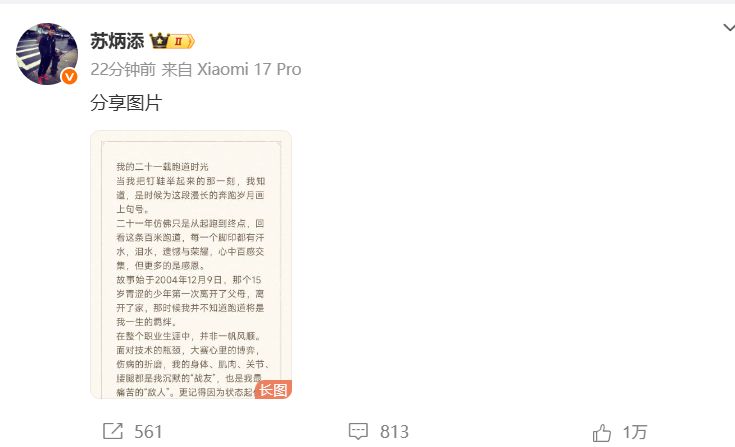 在整個職業生涯中,并非一帆風順,面對技術的瓶頸,大賽心里的博弈,傷病的折磨,我的身體、肌肉、關節、腰腿都是我沉默的“戰友",也是我最痛苦的“敵人”。更記得因為狀態起伏陷入自我懷疑。那道十秒的“黃種人壁壘"像一道無形的欄桿,橫亙亞洲的所有短跑運動員面前,九秒83不只是數字,它是我與團隊的勛章,更是證明“一切皆有可能”,更是一束光,希望能照亮更多中國短跑少年前行,讓他們相信極限是用來打破的。
