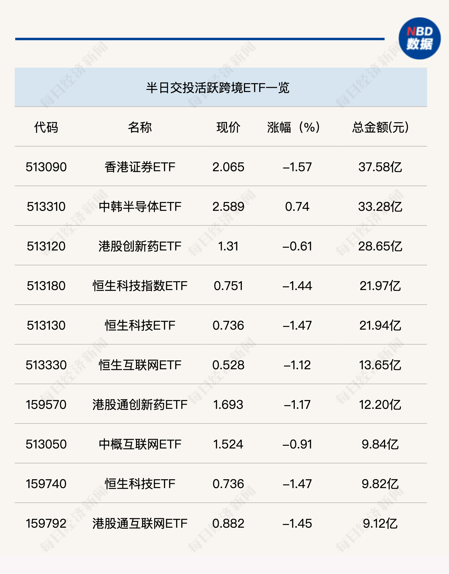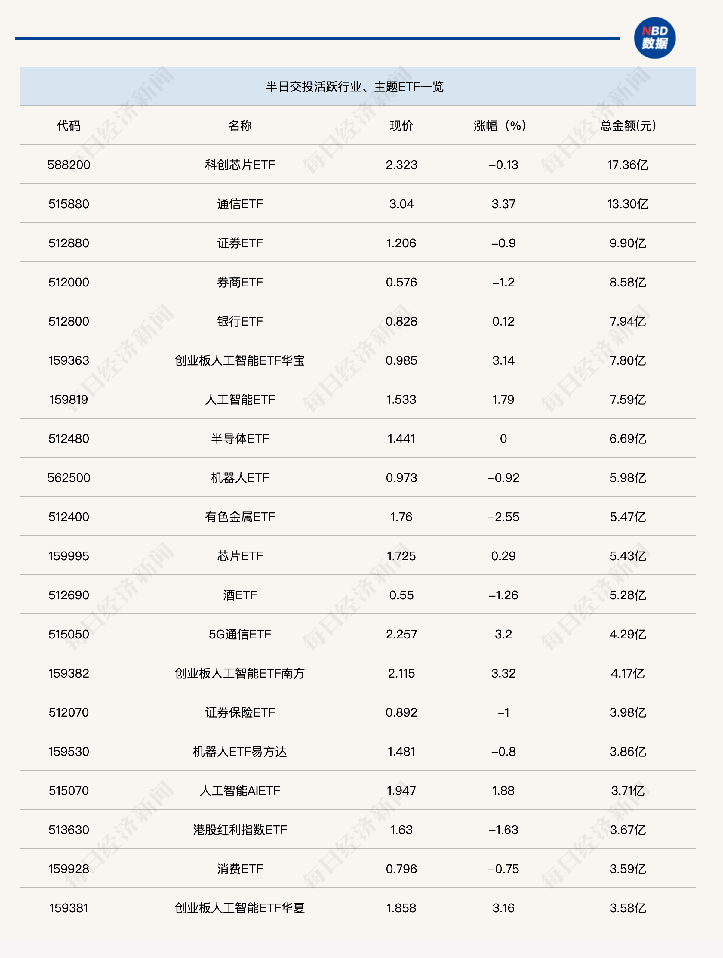 今日上午,通信和金融相關(guān)ETF交投相對活躍。其中,通信ETF(515880)半日成交金額達(dá)到13.3億元,證券ETF(512880)、券商ETF(512000)以及銀行ETF(512800)半日成交金額近10億元。跨境ETF方面,香港證券ETF半日成交金額為37.58億元,成交金額環(huán)比大幅萎縮。