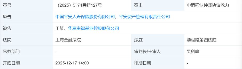 12月10日,記者注意到,天眼查信息顯示,中國平安人壽保險股份有限公司及平安資產管理有限責任公司起訴華夏幸福基業控股股份公司(下稱“華夏控股”)及“王某”。開庭公告顯示,本案案由為“申請確認仲裁協議效力”,審理法院為上海金融法院,開庭日期為12月17日。據知情人士透露,“王某”即華夏幸福董事長王文學。