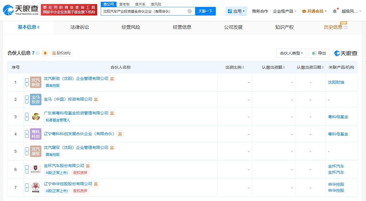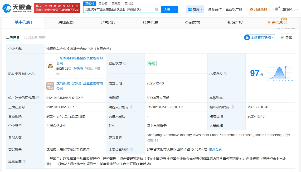 每經AI快訊,天眼查工商信息顯示,近日,沈陽汽車產業投資基金合伙企業(有限合伙)成立,執行事務合伙人為沈汽新致(沈陽)企業管理有限公司、廣東省粵科母基金投資管理有限公司,出資額8億元人民幣,經營范圍包括創業投資、以私募基金從事股權投資、投資管理、資產管理等活動。合伙人信息顯示,該基金由寶馬(中國)投資有限公司、金杯汽車(600609)、申華控股(600653)等共同出資。
