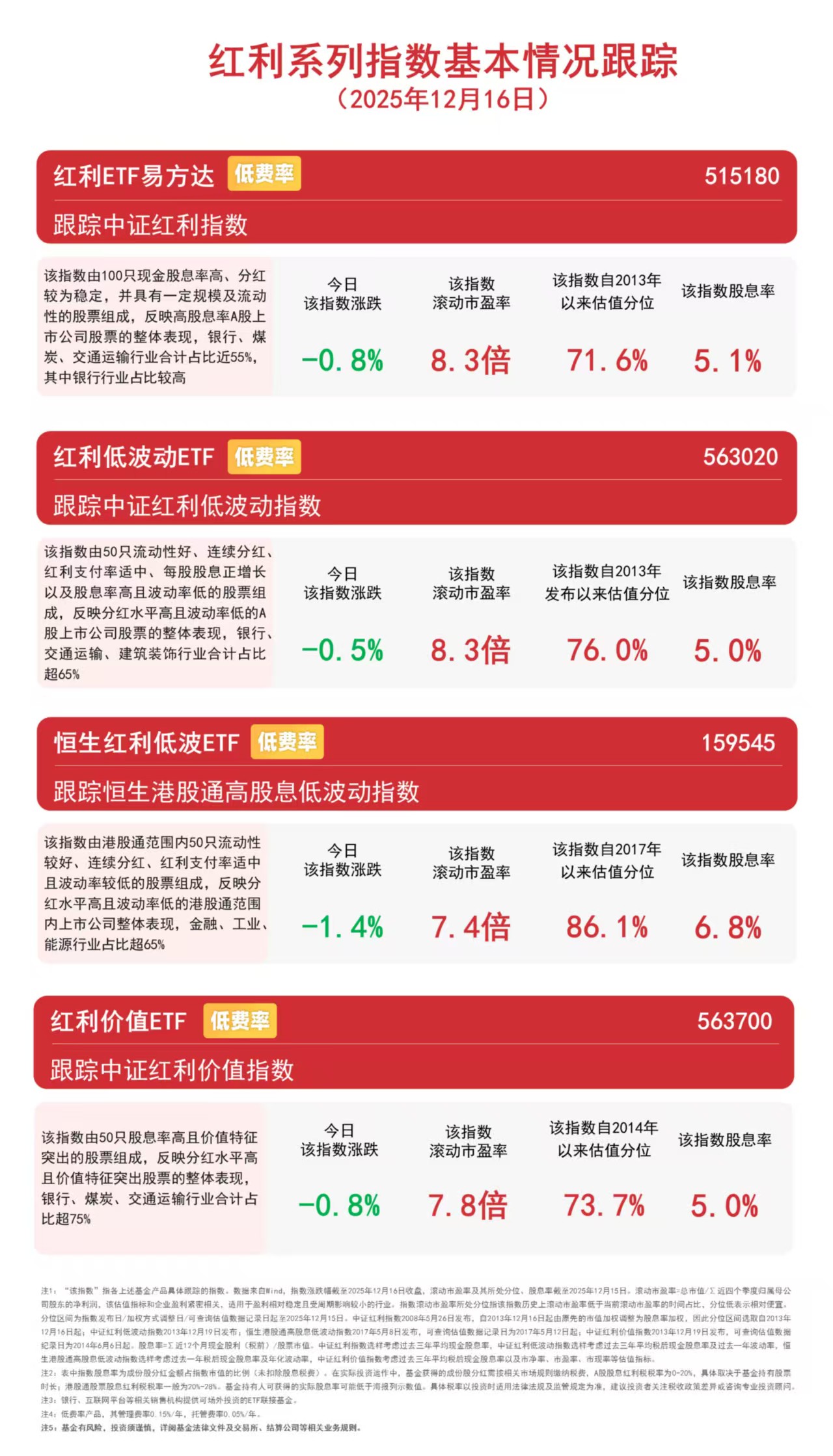 紅利板塊今日小幅回調(diào),截至收盤(pán),中證紅利低波動(dòng)指數(shù)下跌0.5%,中證紅利指數(shù)、中證紅利價(jià)值指數(shù)均下跌0.8%,恒生港股通高股息低波動(dòng)指數(shù)下跌1.4%。Wind數(shù)據(jù)顯示,截至昨日,紅利ETF易方達(dá)(515180)和紅利低波動(dòng)ETF(563020)近一周均連續(xù)“吸金”,合計(jì)凈流入金額都超過(guò)3億元。