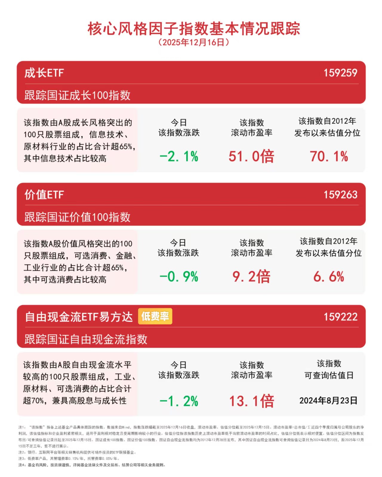 科技方向今日回調,CPO、光芯片、光通信等熱門概念集體跌逾3%。指數層面,國證價值100指數下跌0.9%,國證自由現金流指數下跌1.2%,國證成長100指數下跌2.1%。資金逆勢加倉,成長ETF(159259)全天獲3000萬份凈申購。