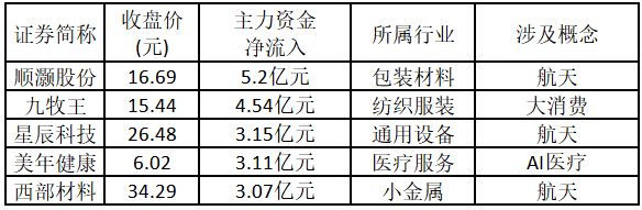 從主力資金來看,今日漲停板個股中,主力資金凈流入金額排名前5的個股分別為順灝股份、九牧王、星辰科技、美年健康、西部材料。