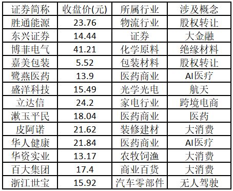 漲停板個股中,股價創出近一年新高的個股有13只(不包括創出歷史新高的個股),包括勝通能源、東興證券、博菲電氣、嘉美包裝、鷺燕醫藥、盛洋科技、立達信、漱玉平民、皮阿諾、華人健康、華資實業、百大集團、浙江世寶,具體如下表所示。
