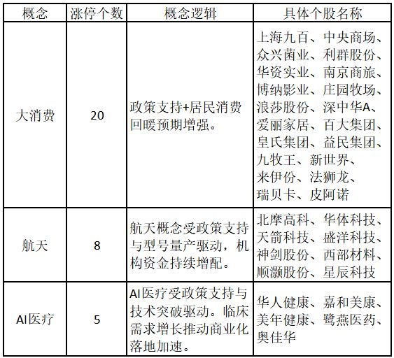 從概念特征來看,今日漲停板個股中,大消費、航天、AI醫療的個股最多。