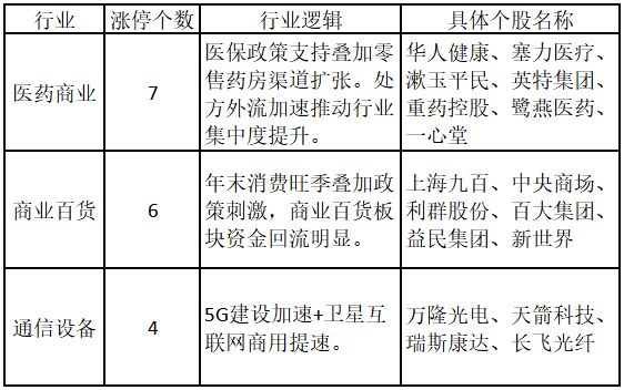 從行業特征來看,今日漲停板個股中,醫藥商業、商業百貨、通信設備行業的個股最多。
