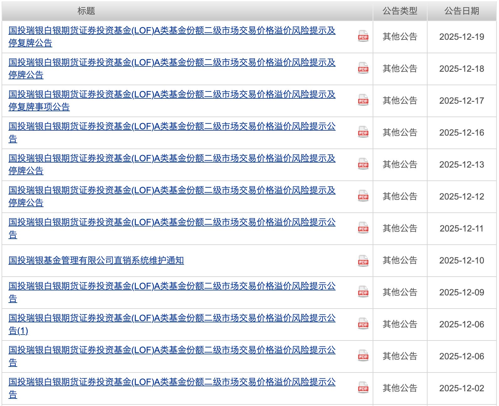 12月18日,國投瑞銀白銀期貨(LOF)再次發布一則溢價風險提示公告。截至12月18日,該基金二級市場的收盤價為2.332元,明顯高于基金份額凈值。12月以來,該基金還連續發布了九條相關公告,多次觸發盤中停牌。