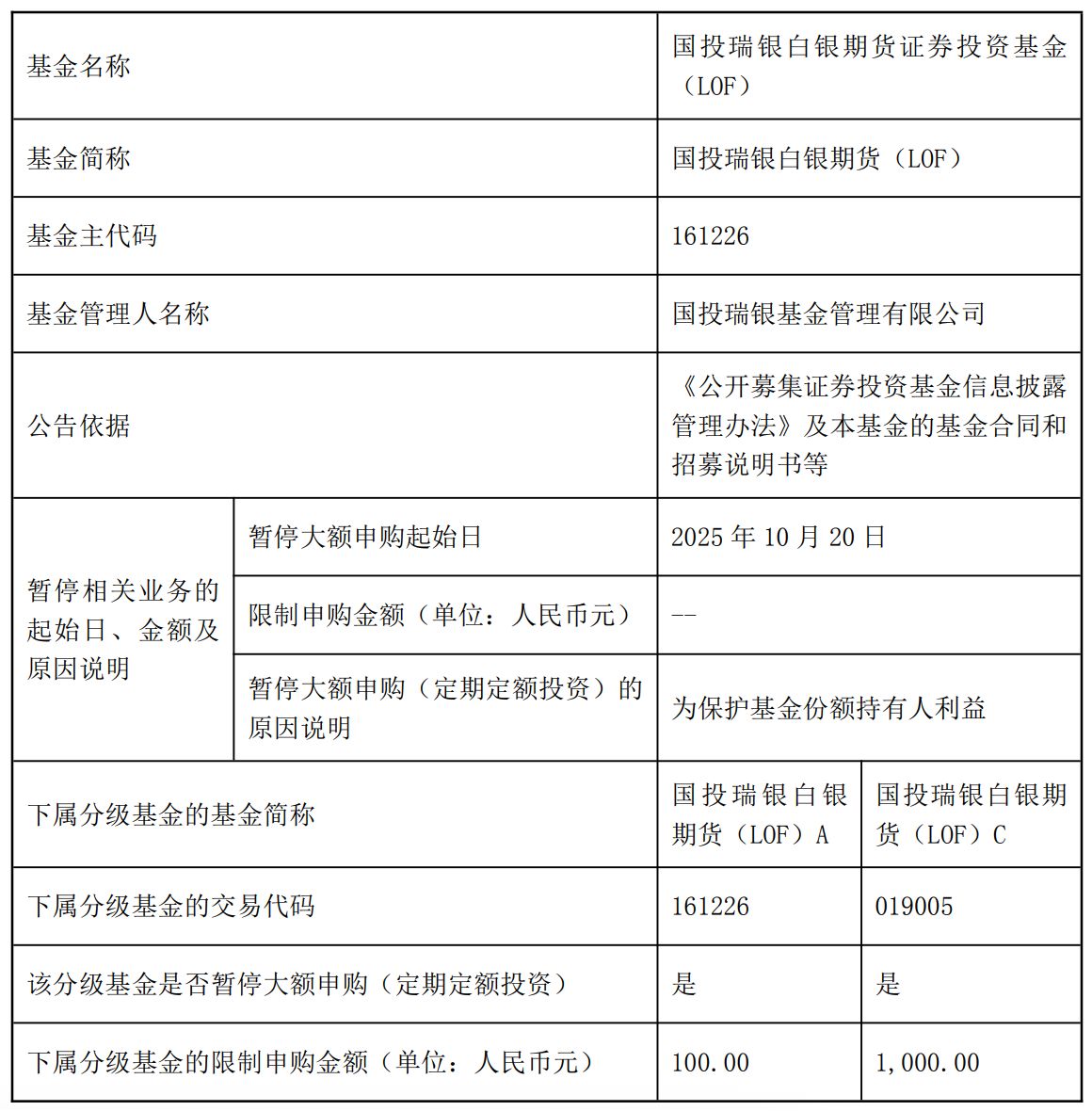 據悉,今年以來,考慮到市場單邊上行,跟蹤難度加大,國投瑞銀白銀期貨(LOF)為維護持有人利益,屢次下調申購限額。截至目前,該基金A類份額申購限額已下調至100元,C類份額下調至1000元。