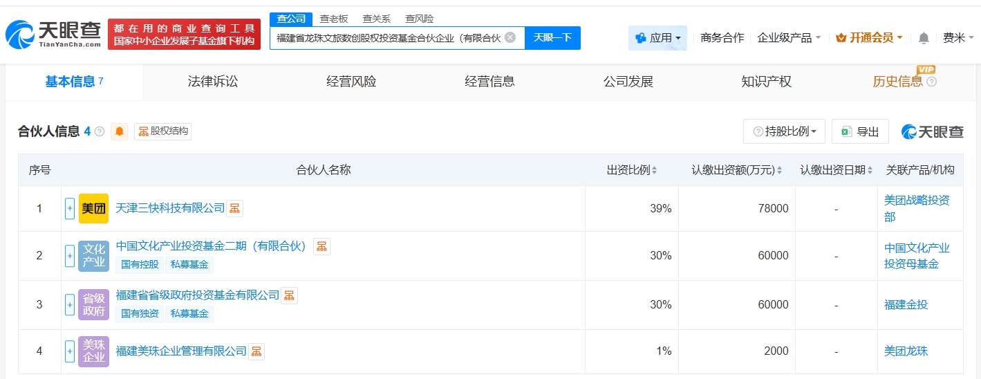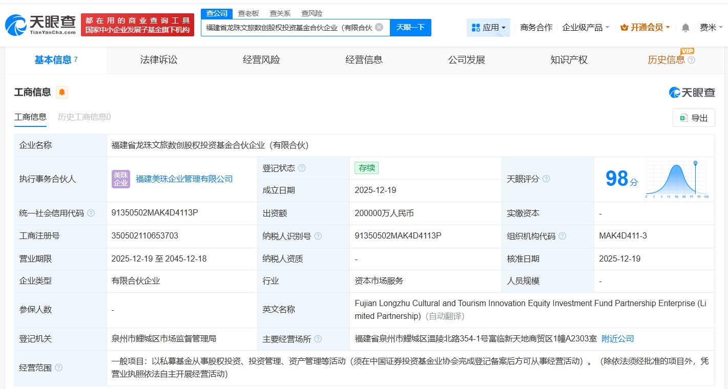 每經AI快訊,天眼查App顯示,近日,福建省龍珠文旅數創股權投資基金合伙企業(有限合伙)成立,執行事務合伙人為福建美珠企業管理有限公司,出資額20億元人民幣,經營范圍為以私募基金從事股權投資、投資管理、資產管理等活動,由美團旗下天津三快科技有限公司、中國文化產業投資基金二期(有限合伙)、福建省省級政府投資基金有限公司、福建美珠企業管理有限公司共同出資。