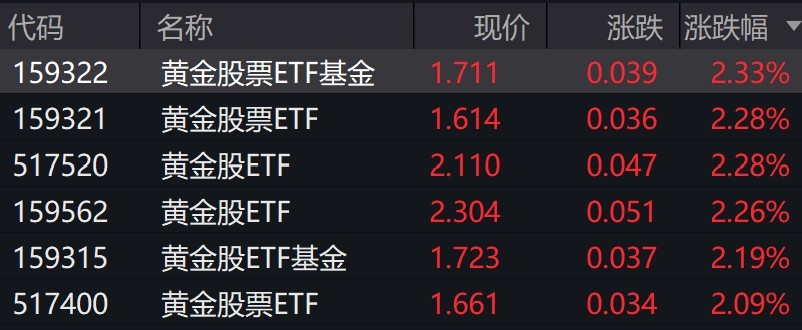 受盤面影響,黃金股相關(guān)ETF漲超2%。