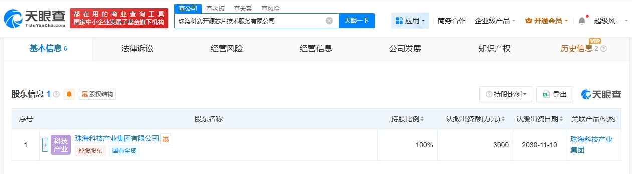 每經AI快訊,天眼查工商信息顯示,近日,珠??瀑愰_源芯片技術服務有限公司成立,法定代表人為金虎,注冊資本3000萬元人民幣,經營范圍包括工程和技術研究和試驗發展、集成電路設計、集成電路芯片設計及服務、科技中介服務等。股東信息顯示,該公司由珠海科技產業集團有限公司全資持股。