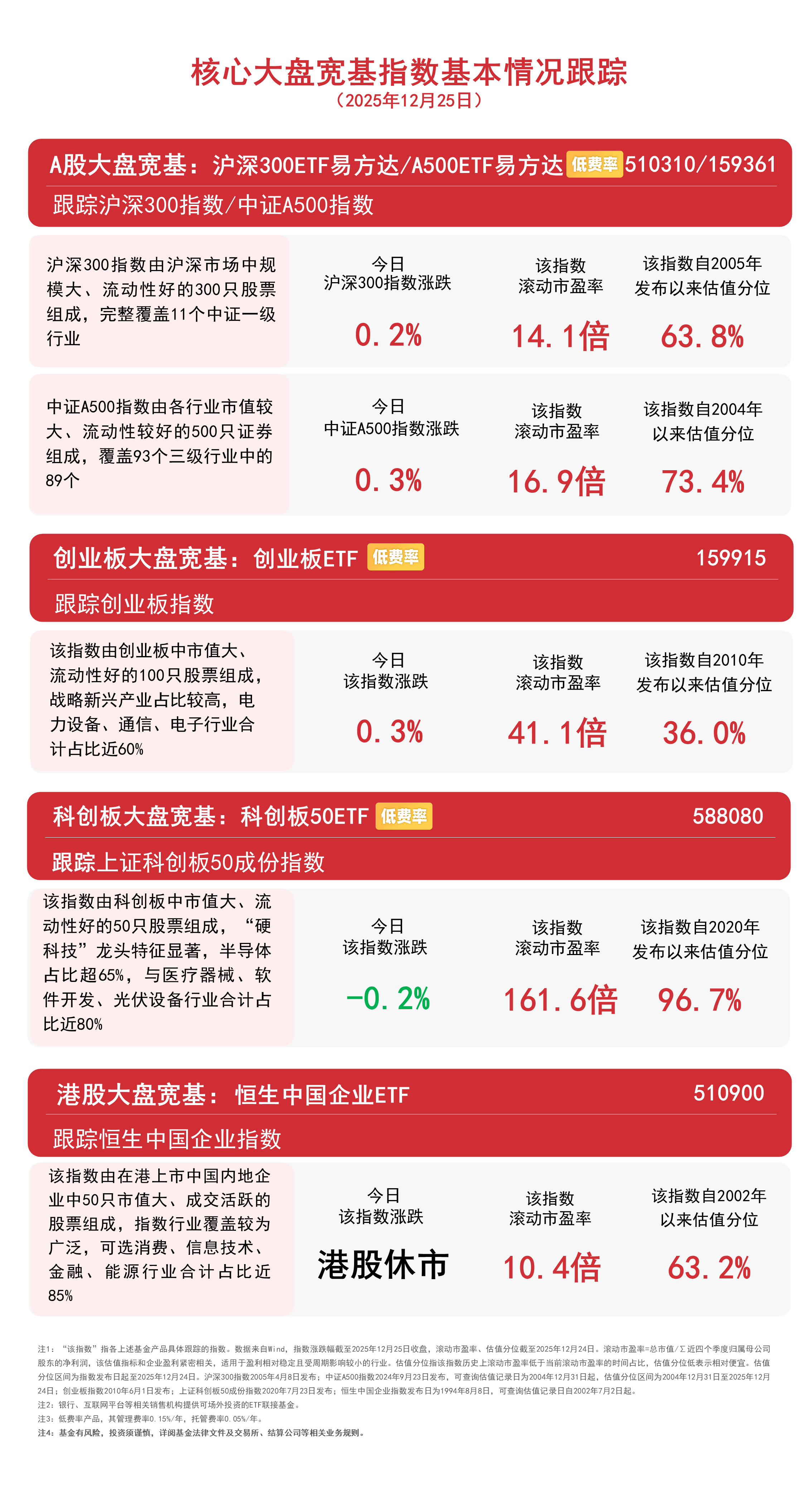 12月25日,市場午后走強,滬指低開高走錄得7連陽,全市場成交額達1.94萬億元,較上日放量超400億元,超3700只個股上漲,盤面上,商業航天概念持續活躍,機器人板塊大幅拉升。截至收盤,中證A500指數上漲0.3%,滬深300指數上漲0.2%,創業板指數上漲0.3%,上證科創板50成份指數下跌0.2%。
